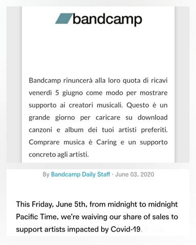 Domani 5 giugno Bandcamp rilascia il 100% degli introiti agli artisti, per supportarli concretamente in questo periodo di difficoltà economiche degli stessi, dovute alle conseguenze del Covid. Per 24 ore, precisamente da mezzanotte a mezzanotte Pacific Time del 5 giugno. Per l’Europa mediamente significa dalle 8h del 5 giugno alle 8h del 6 giugno.