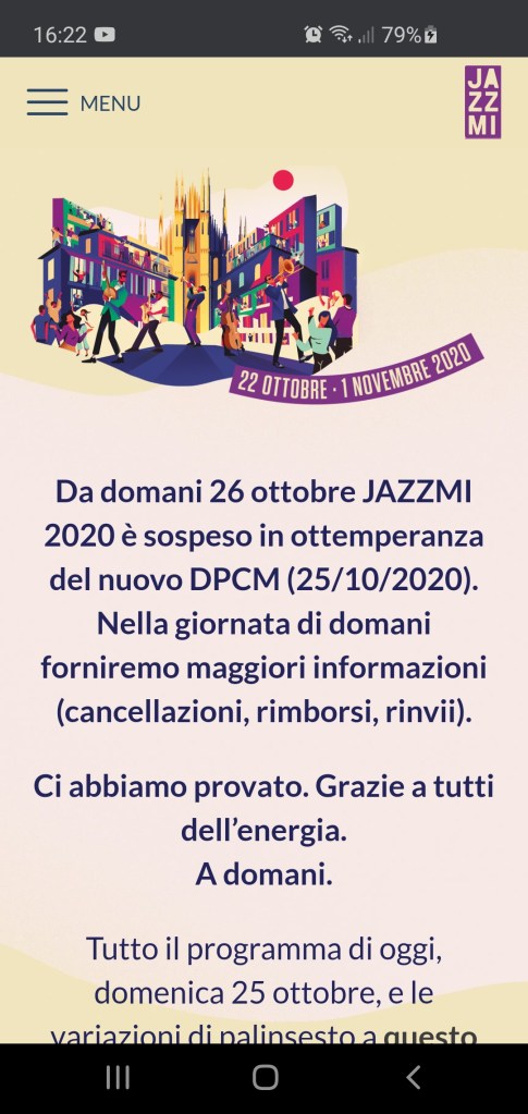 Dopo essersi destreggiata con improvvisi forfait venuti dai pochi musicisti stranieri invitati, ora anche JazzMi è stata ‘giustiziata’ dall’ultima ordinanza governativa, insieme a tutto il resto del mondo dello spettacolo e della cultura. Inutile far presente che venerdì sera al Teatro della Triennale (ex Teatro dell’Arte, quello dei debutti italiani dei gruppi di Miles Davis e di John Coltrane, per intenderci) si godeva di un ricircolo d’aria ottimale per la stagionatura del prosciutto di Parma, climatizzazione che si poteva semplicemente sognare nella quasi totalità degli ambienti lavorativi che ho frequentato nei miei ultimi anni passati ai piani alti del Terziario Avanzato… ma si sa, anche in epoca pandemica la salubrità dei siti lavorativi è un articolo di fede (forse perché se ne occupa direttamente lo Spirito Santo…). Temo che per gli organizzatori, che contano tra l’altro solo su una pattuglia di sponsor privati, si profili un bagno di sangue che potrebbe riflettersi anche sulla fattibilità di future edizioni, considerati anche gli strascichi delle cancellazioni nei rapporti con artisti, tecnici, siti ospitanti etc. Anche su questo mi auguro di sbagliarmi, ma temo si tratti di ottimismo della volontà. Del resto, è stato pianamente spiegato con brutale chiarezza: poco importa che teatri, cinema e sale da concerto non rappresentino seri rischi per la salute pubblica (al contrario di altre attività, ma quelle sono sostenute da lobbies ben più rumorose e talvolta anche armate…), l’importante è eliminare ogni motivazione che possa portare le persone ad uscire di casa al di fuori delle mere esigenze di sopravvivenza materiale. Bella prospettiva regressiva e distopica, da mettere in conto più che ad indubbie intemperanze e strafottenze di pochi (peraltro molto scarsamente rintuzzati e nemmeno decisamente stigmatizzati pubblicamente), ad una vera e propria Caporetto politica, tecnica e burocratica che questa sì ha nomi e cognomi, al contrario del fantascientifico incubo materializzatosi nella scorsa primavera. Sarò forse un tantino invelenito, ma mi sembra di assistere al trionfo postumo del ginnico camerata Achille Starace o del manesco Scelba del ‘culturame’.
