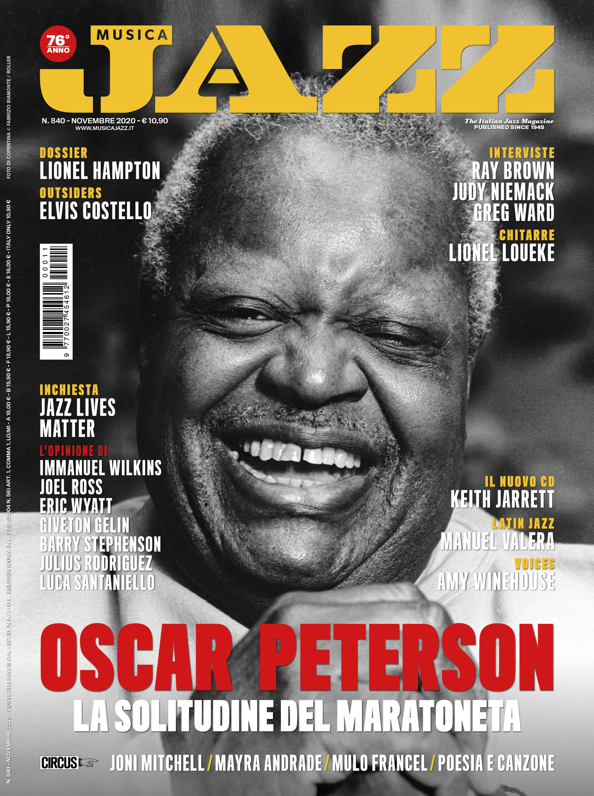 “Da moltissimi anni non dedicavamo la copertina a un maestro del jazz come Oscar Peterson. A oltre dieci anni dalla sua scomparsa, era arrivato il momento di rimediare, e nel numero di novembre troverete anche un lungo saggio che ne ripercorre vita e opere. Da Peterson siamo poi partiti per allargare il tiro su altri gloriosi veterani che col pianista canadese hanno, nel corso dei decenni, condiviso palcoscenici e sale d’incisione: Lionel Hampton e Milt Jackson, due dei più illustri vibrafonisti di ogni tempo, e un contrabbassista supremo come Ray Brown. Tutti loro sono anche i protagonisti del cd allegato, una vorticosa cavalcata dal 1954 al 1961 in cui i protagonisti giocano – è il caso di dirlo – a rubarsi la scena in una torrida festa di swing.“