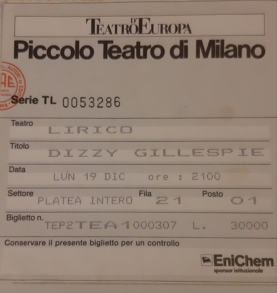 Chi scrive ha un ricordo lontano dell’unico concerto di Dizzy visto a Milano il 19 dicembre, credo del 1987, al Piccolo Teatro. Poco è rimasto nella memoria di quell’esibizione, olte alla reliquia qui riprodotta, se non le proverbiali guance gonfie del trombettista e la sua usuale verve sul palco. Più vivido il ricordo di un viaggio in treno, io ed un amico, vestiti a doppio strato per timore dei freddi milanesi. Salvo trovarci poi accaldati e sudanti in un Piccolo dalla temperatura più che confortevole.