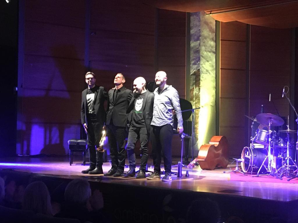 Ma la vera sorpresa, almeno per me, è stata ritrovare a distanza di pochi anni dall’ultimo ascolto live non più un ottimo solista accompagnato da un buon trio, nel quale eccelle il pianista, bensi’ un vero gruppo, rodato e perfettamente paritario, in cui le voci soliste sono addiritura tre, considerando la crescita esponenziale del contrabbassista Jacopo Ferrazza ed il talento straripante di Julian Oliver Mazzariello al pianoforte.