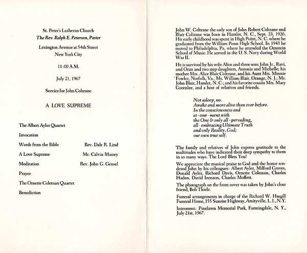 Successivamente, il trombettista Calvin Massey lesse la poesia A Love Supreme (quella che compare nel libretto dell’omonimo album). E il quartetto di Ornette Coleman, con Charlie Haden, David Izenzon e Charles Moffett, pose fine al rito (la registrazione del brano di Coleman Holiday For A Graveyard apparve nella compilation Head Start, edita da Bob Thiele qualche anno dopo). John Coltrane fu sepolto al Pinelawn Memorial Park a Long Island.ion.