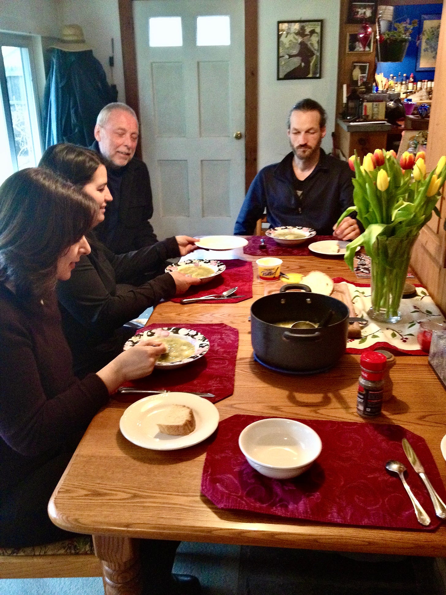 Mentre mangiavamo la zuppa cucinata da Dave, guardavamo il verde primaverile del suo cortile e il fiume al di là. Dave ha parlato di un periodo negli anni ’70 in cui l’intero cortile era occupato da un orto, dove la sua famiglia coltivava d’estate e conservava per l’inverno.