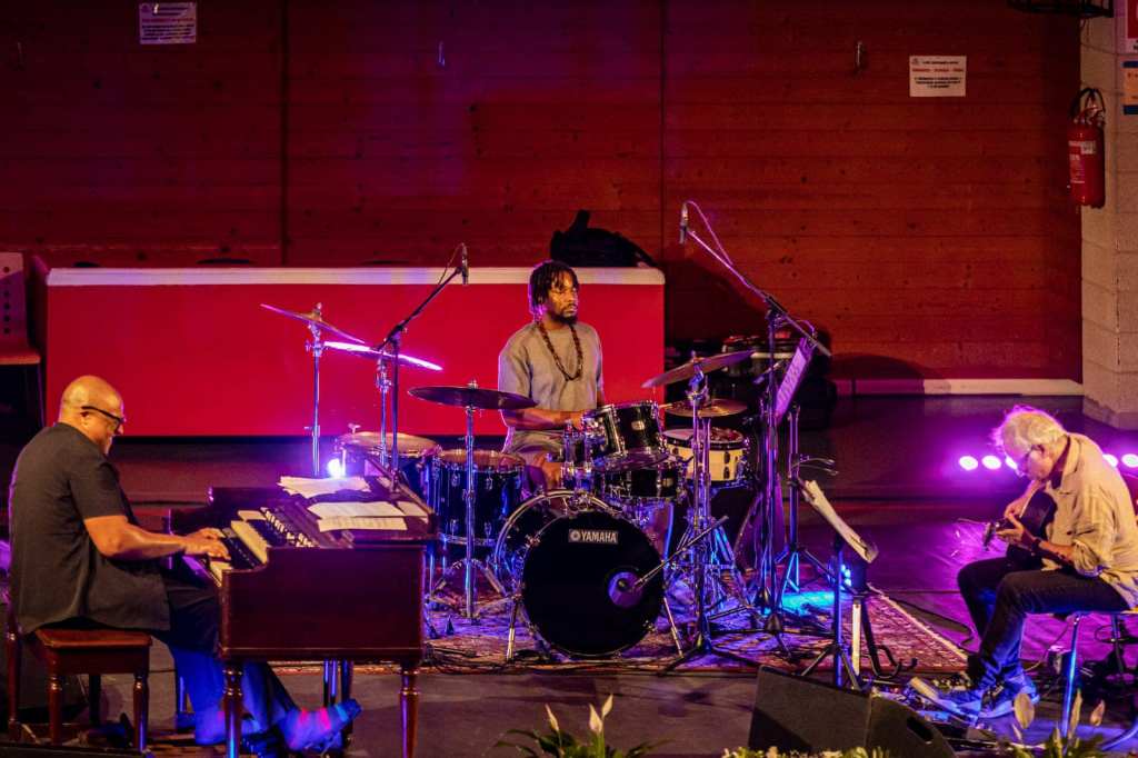 La scaletta ha attraversato gli standard (“Come rain or come shine” ), i classici del soul jazz ispirati dalla chitarra di Grant Green , jazzista assai amato da Ribot che ha omaggiato il gigante di Saint Louis eseguendo due sue composizioni: “Ain’t it funky” , che ha messo a rischio le fondamenta della palestra che ospitava il concerto, e la decontratta ” Grandstand” dall’omonimo Blue Note del ’62. Le venature salsa e latin di Joe Bataan ( “After shower funk” ) e una perla come “Neck bones ” di Gene Ammons, brano in origine donata al groove di Jimmy Smith hanno chiuso un concerto esplosivo, di grande energia e ben connesso con un auditorio che nonostante la location non fosse quella prevista in cartellone, causa meteo, ha reclamato ed ottenuto due lunghi e roventi bis di un Trio dal cuore soul ed anima jazz.