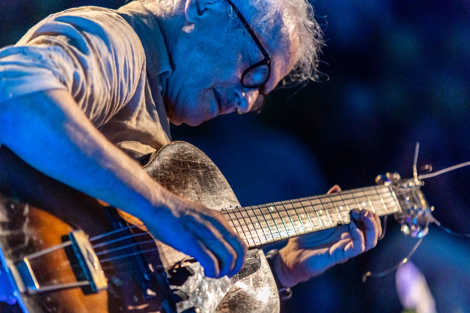 Ribot, ripiegato sulla chitarra come sua abitudine, in uno stato di fusione fisica e spirituale con il proprio strumento, ha iniziato un gioco di continue connessioni con l’hammond b3 di Greg Lewis, capace di produrre un suono ricco di calore e colore; Lewis ha giostrato sulla tastiera da grande interprete dell’organo, donando ricami delicati, sostenute trame melodiche e orditi ritmici, oltre a un respiro strumentale che genera un suono enorme come il suo esecutore, tenuto a lungo e ricco d dinamiche multi-strato. Le lunghe linee di basso ottenute con l’utilizzo (a piede scalzo!) dei pedali hanno segnato il concerto, così come l’inesauribile colonna ritmica garantita dal giovane e promettente drummer di New Orleans Joe Dyson (già collaboratore del compianto hammondista Dr. Lonnie Smith, anche nel live All in my mind ).