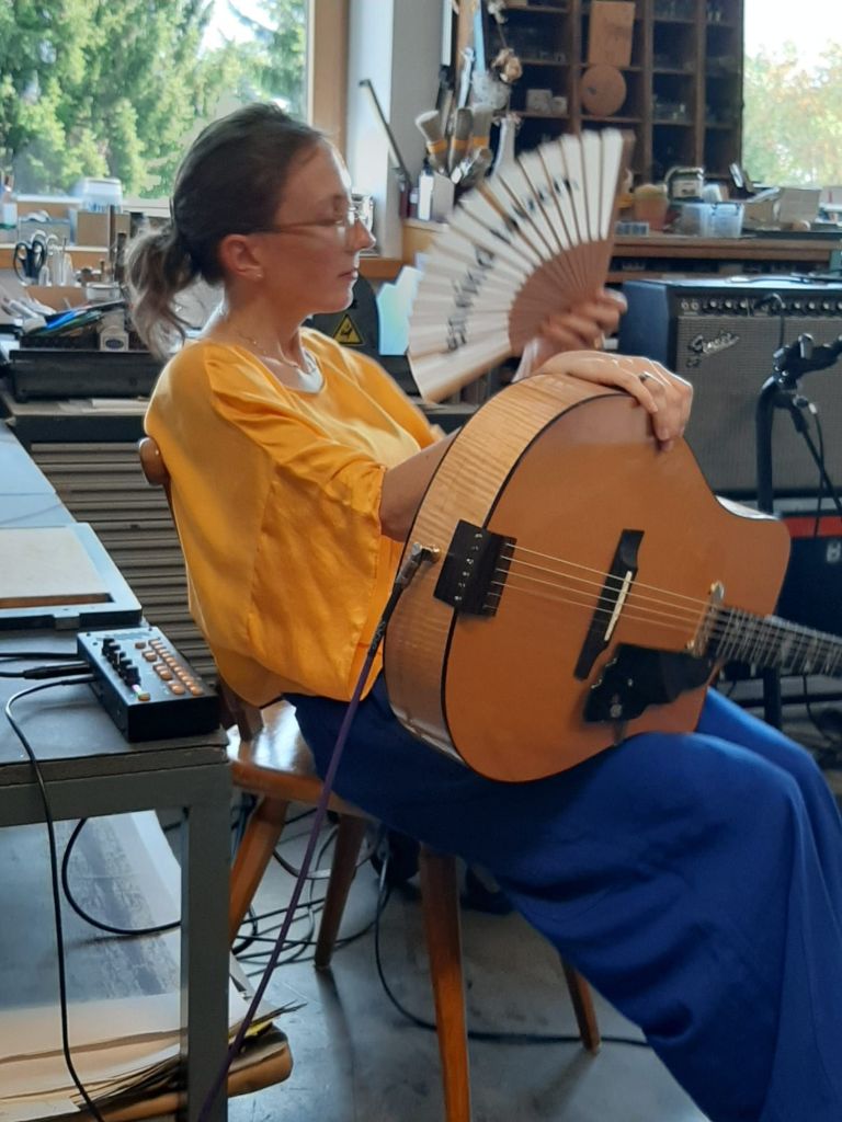 Nemmeno il tempo di riprendersi dal talento straripante di Tomeka e Sofia che già è l’ ora del duo, sulla scena e nella vita, tra Tomas Fujiwara alla batteria e Mary Halvorson alla chitarra. Set equilibrato e raffinato nel solco di un interscambio costante di stimoli e rimandi, tra cui l’imprevista ma bellissima versione di Ida Lupino, celebre tema di Carla Bley. Il concerto si svolge nella antica stamperia sovraffollata, con un caldo che costringe la chitarrista a ricorrere a vecchi rimedi…