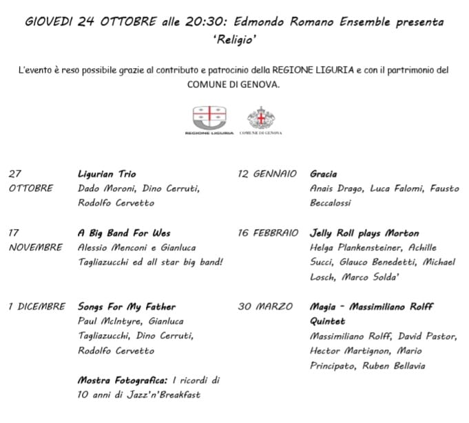 Le ricorrenze nel jazz hanno un significato particolare, e quando una rassegna nata quasi per scommessa arriva al decimo compleanno è davvero il caso di festeggiare e fare un pò di riepilogo delle pagine felicemente passate. E’ quanto avverrà ad avvio dell’edizione 2024 della rassegna Jazz’n’breakfast, ideata e diretta da Rodolfo Cervetto, affermato batterista della scena jazz nazionale e promotore instancabile di mille iniziative legate a questa musica, oltrechè Presidente del più longevo jazz club cittadino, il Louisiana . Per “raccontare” la storia dei dieci anni di Jazz’n’breakfast, iniziata nel 2015 con un concerto del trio del sassofonista Antonio Marangolo, si è pensato ad un’occasione speciale, un concerto, questa volta serale, di un ampio enesemble diretto da Edomondo Romano, poliedrico autore e musicista genovese da sempre in bilico fra i generi – jazz, world, progressive – con una spiccata attitudine all’indagine sugli aspetti più profondi dell’umanità. I capitoli di “Religio”, titolo del recente album di Romano dito da Visage music saranno interpretati, giovedì 24 ottobre al Tetaro Modena, da Simona Fasano, Karin Selva, Giulia Beatini, Roberto Tiranti – alle voci, Tina Omerzo al pianoforte , Rodolfo Cervetto alla batteria, Alessandro Serri – chitarra elettrica, programmazione, Luca Falomi – chitarra classica, Riccardo Barbera , contrabbasso, insieme ad un quartetto d’archi composto da Fabio Biale, Daniele Guerci Ilaria Bruzzone e Arianna Menesini .