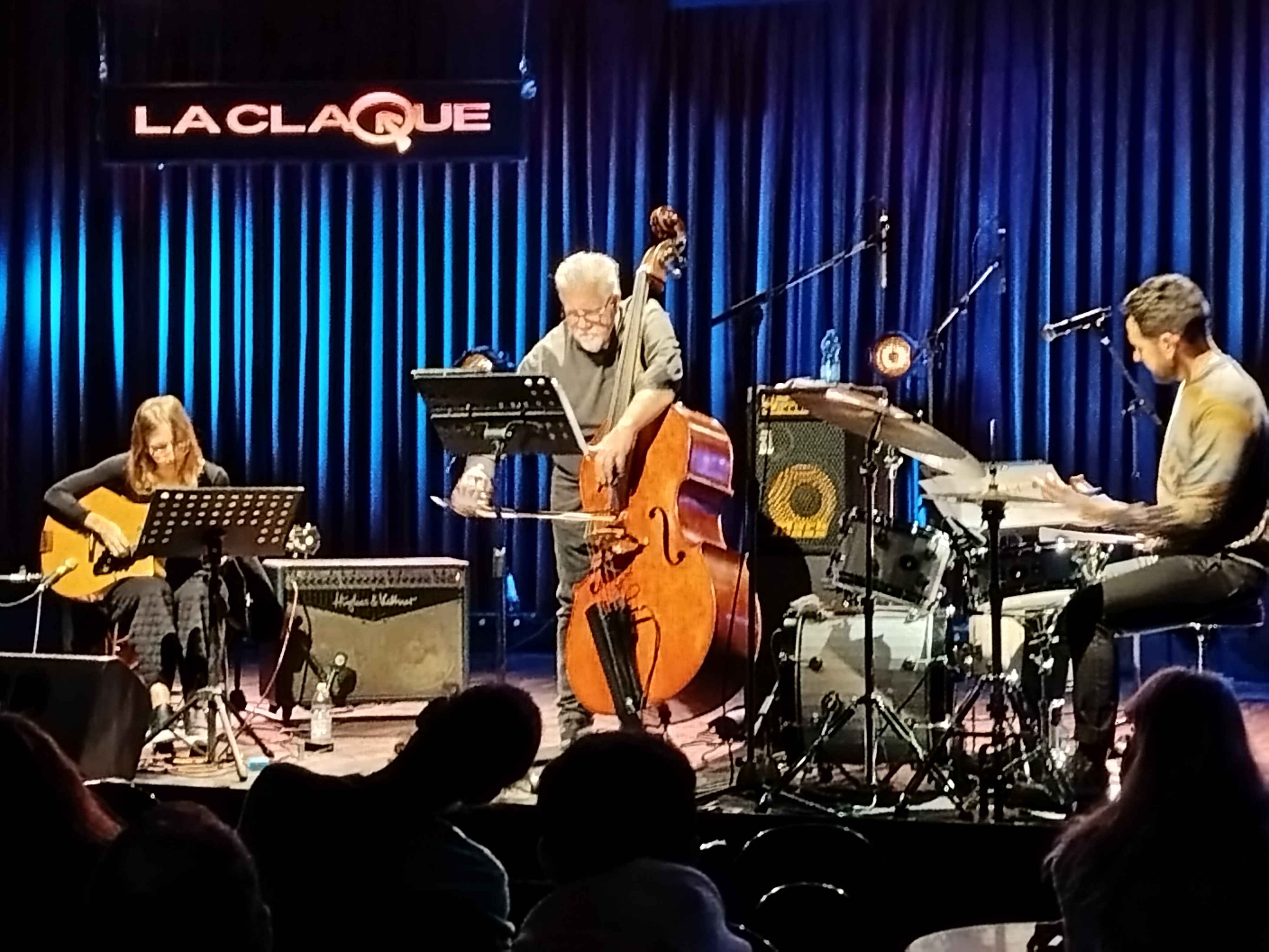 Genova isolata dal giogo delle autostrade in perenne manutenzione, fuori dal giro dei grandi eventi musicali per mancanza di spazi o di capacità organizzative, aggrappata, per quanto riguarda il jazz, alla lodevole ma sproporzionata programmazione di due clubs cittadini e poco più, per una volta si è presa una rivincita. Sede della prima ed unica data in Italia, giovedì 14 novembre, del trio Thumbscrew, ovvero Michael Formanek, Mary Halvorson e Tomas Fujiwara, una delle formazioni più note, autorevoli ed originali del jazz contemporaneo, ospitata sul palco de La Claque in chiusura della stagione autunnale del festival Gezmataz. Un centinaio di persone la platea, che ha avuto pienamente ragione della serata climaticamente non invogliante l’uscita. Dal vivo le peculiarità del trio già conosciute attraverso gli otto dischi pubblicati insieme, risaltano in modo ancora più vivido. L’impressione è di avere di fronte tre solisti che, per un gioco del caso, sono riusciti a trovare i giusti incastri per fare convivere i propri strumenti, un basso che scolpisce le note o le accarezza con estrema dolcezza, la chitarra agilissima che talvolta devia della realtà per seguire percorsi immaginari (a me ricorda sempre , con quelle scivolate di toni, gli orologi molli di Dalì), la batteria che vola libera, spesso indipendente dal ruolo di supporto ritmico.