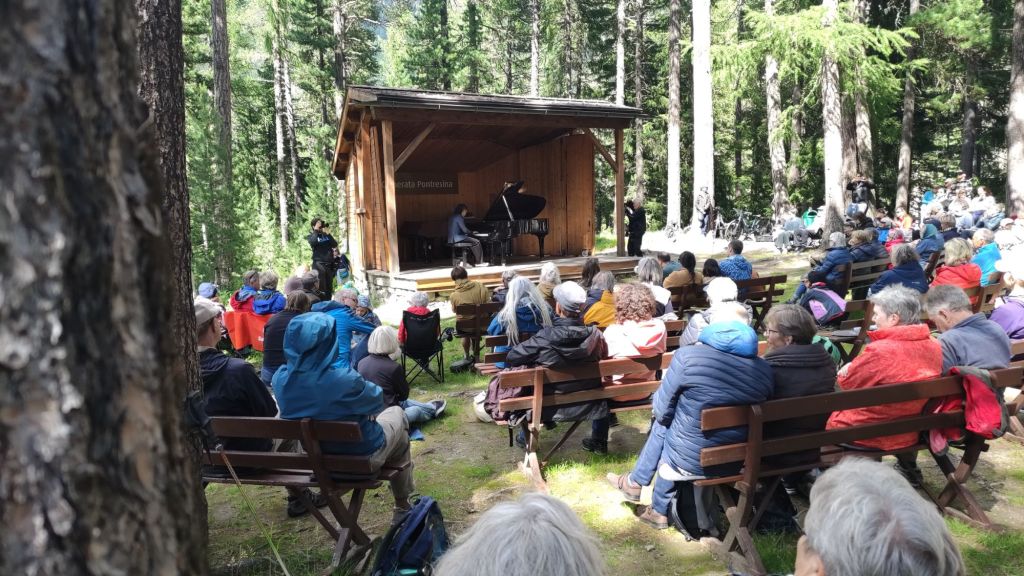 Il concerto gratuito più interessante è quello che vede Gregory Privat al pianoforte in una location fatata, Taiswald, un piccolo palco nel bosco di Pontresina, dove nel silenzio più attento e concentrato, rotto occasionalmente dal fruscio del vento, il pianista della Martinica ha dato vita ad un ora di ottima musica, riuscendo più volte a coinvolgere anche il pubblico, nonostante la temperatura tutt’altro che estiva, come si evince dalla mia foto.