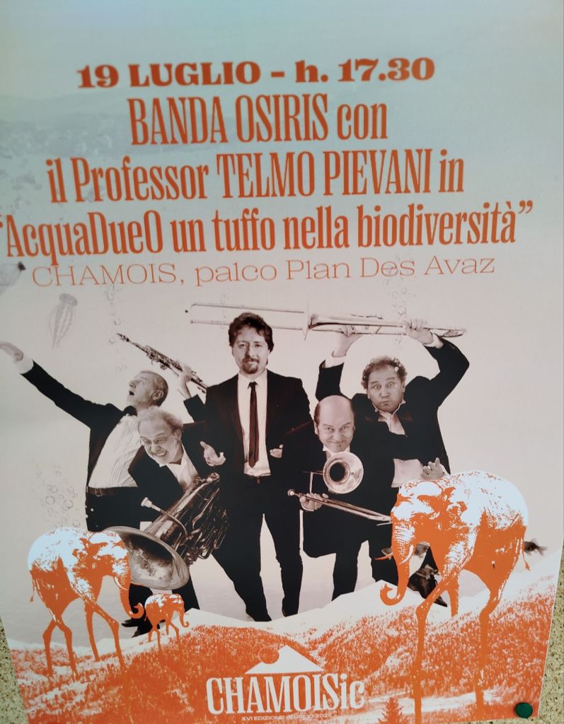 E lo spettacolo pomeridiano AcquadueO della Banda Osiris con lo scienziato Telmo Pievani presso la sala del Bar Chamois, gremita di una platea che ha letteralmente abbracciato musicisti e conduttore impegnati in un equilibristico happening fra scienza.musica e comicità. Banda Osiris in piena forma nell’animare ed illustrare con la verve umoristica ben conosciuta i temi fondamentali dei nostri tempi e luoghi affrontati da un rigoroso e complice Pievani.