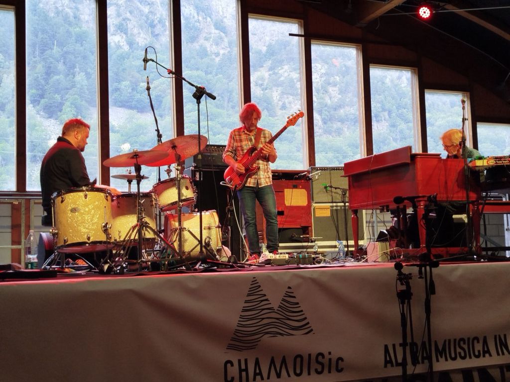 Dopo il blues acustico di Elisabetta Maulo e Mattia Donati, domenica 20 era di scena il set clou del festival, il secondo concetto in assoluto in Italia del trio norvegese Elephant 9, dopo l’esordio nel 2022 nell’edizione del Torino jazz Festival codiretta da Giorgio Li Calzi.. Concerto spostato dalla frazione sede del festival al centro sportivo di Antey St Andre’ causa meteo incerto, ed afflitto da problemi di viaggio aereo dei membri del gruppo in arrivo dal Nord Europa. Eppure, magicamente, alle 17 tutto pronto ed il palazzetto del paese pieno dei fans del festival trasferiti a valle. La musica degli Elephant 9 è un’onda ritmica travolgente che si infrange su litorali psichedelici. Il concerto parte con un lungo brano floydiano “I cover the mountain top”, che permette di mettere a fuoco gli ingredienti del gruppo: il lavoro strutturale e l’ampia tavolozza timbrica dell’organo hammond, del fender e delle tastiere di Stale Sorlokje, il basso metronomico, implacabile costruttore di riff di Nikolai Hængslee, e l’incandescente batteria di Torsten Lofthen, che sforna ritmo e grooves in ciclo continuo, suonando con due, quattro bacchette o a mani nude, squadrando con scansioni tonitruanti le fondamenta dei brani presentati. Echi di Soft Machine nelle sonorità dell’organo, percorsi angolari progressive e riff rock e funk attraversano i novanta minuti di un concerto ad elevato tasso energetico che ha attinto a tutta la storia del trio. Un bel modo di sigillare un’edizione di Chamois che è riuscita ad avere la meglio anche sul tempo.