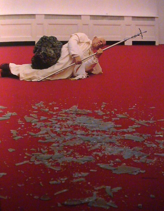 Maurizio Cattelan, La nona ora, 1999. Lattice, cera, poliestere, roccia vulcanica, tessuto, pastorale in argento, tappeto, vetro. Collezione privata. Mettere nero…